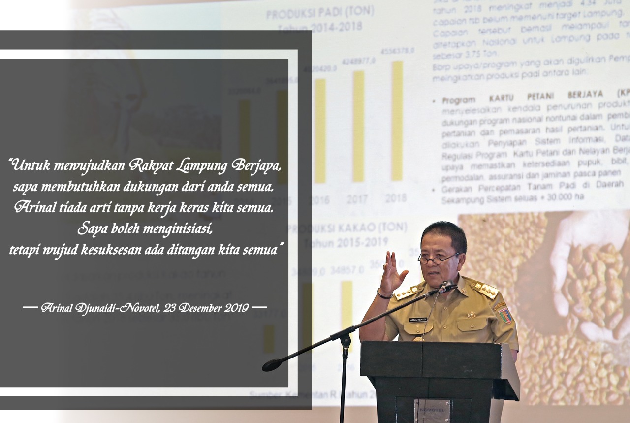 Pada kesempatan itu, Gubernur juga menyampaikan untuk mewujudkan Rakyat Lampung Berjaya dirinya membutuhkan dukungan dari semua pihak. “Untuk mewujudkan Rakyat Lampung Berjaya, saya membutuhkan dukungan dari Anda semua. Arinal tiada arti tanpa kerja keras kita semua. Saya boleh menginisiasi, tetapi wujud kesuksesan ada di tangan kita semua,” ujar Arinal.