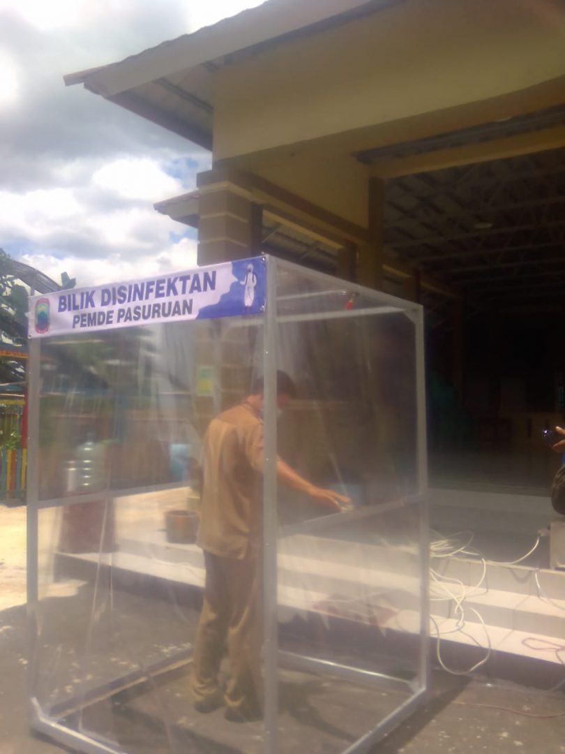Bilik disinfektan disediakan di pintu masuk kantor desa setempat, sehingga seluruh pegawai harus melaluinya sebelum masuk ke area kerja.