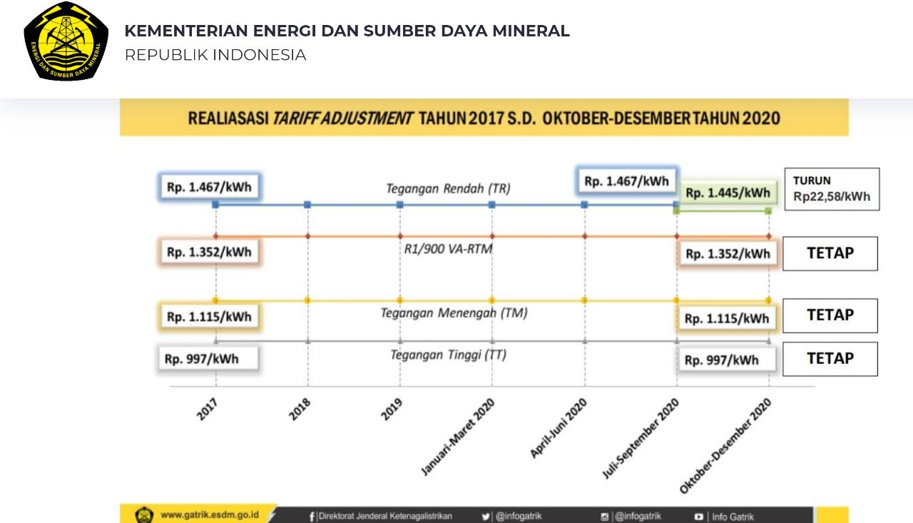 Dengan hal ini maka harga per/KWh untuk tarif golongan rendah yang sebelumnya 1.467/kWh kini turun menjadi 1.444,70/kWh atau turun 22,5/kWh. Penetapan ini berlaku untuk bulan oktober sampai desember 2020.