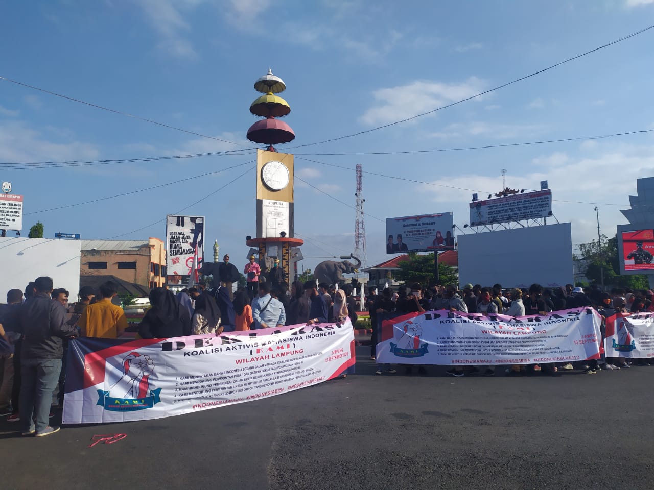 Bandar Lampung, mediarepublika.com — Ratusan mahasiswa yang tergabung dalam Koalisi Aktivis Mahasiswa Indonesia (KAMI) menggelar aksi di Bundara Tugu Adipura, Kota Bandar Lampung, Lampung, Minggu, 13 September 2020. Mereka mengingatkan semua pihak dan pemerintah bersatu menangani covid-19 .