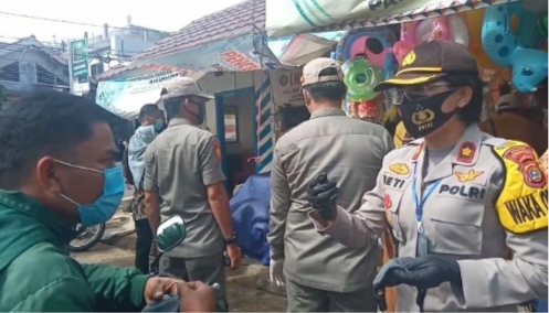 Selanjutnya, Kapolsek Pugung Ipda Okta Devi, SH. MH mendampingi Dandim 0424/Tanggamus Letkol Inf. Arman Aris Sallo membagikan masker di Pasar Babakan Kecamatan Pugung.
