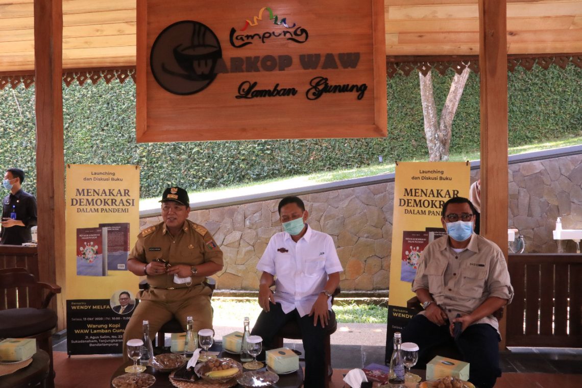Bandar Lampung, mediarepublika.com — Gubernur Lampung, Arinal Djunaidi, menghadiri acara Launching & Diskusi Buku “Menakar Demokrasi Dalam Pandemi”, di Warung Kopi WAW Lamban Gunung Jl. Agus Salim No.25 Sukadanaham Bandar Lampung, Selasa (13/10).