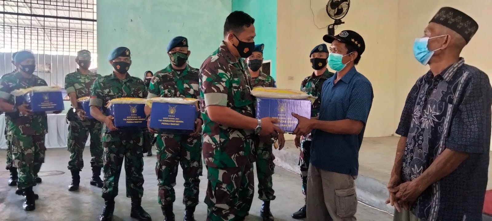 Kalianda- Dalam rangka Safari Binpotdirga TNI AU Peduli, Mabes TNI Angkatan Udara (AU) membagikan 1.000 paket kepada warga di kecamatan Natar, Lampung Selatan (Lamsel) yang terdampak pandemi covid-19, Rabu (8/12/21).
