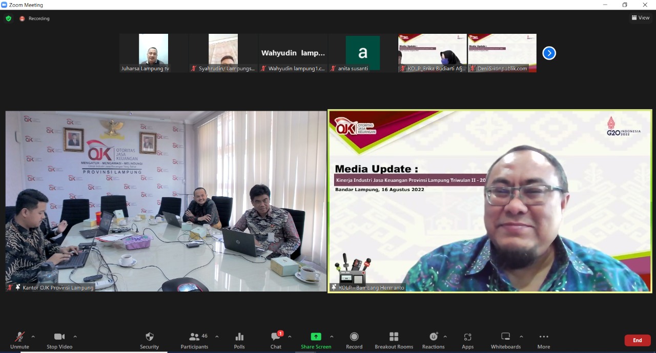 Hal ini diharapkan akan semakin mempercepat pemulihan ekonomi baik di daerah maupun secara nasional” ungkap Kepala OJK Provinsi Lampung, Bambang Hermanto dalam acara Update Perkembangan Industri Jasa Keuangan di Provinsi Lampung Triwulan II 2022, bersama insan media pada Selasa (16/8) secara daring via Zoom.