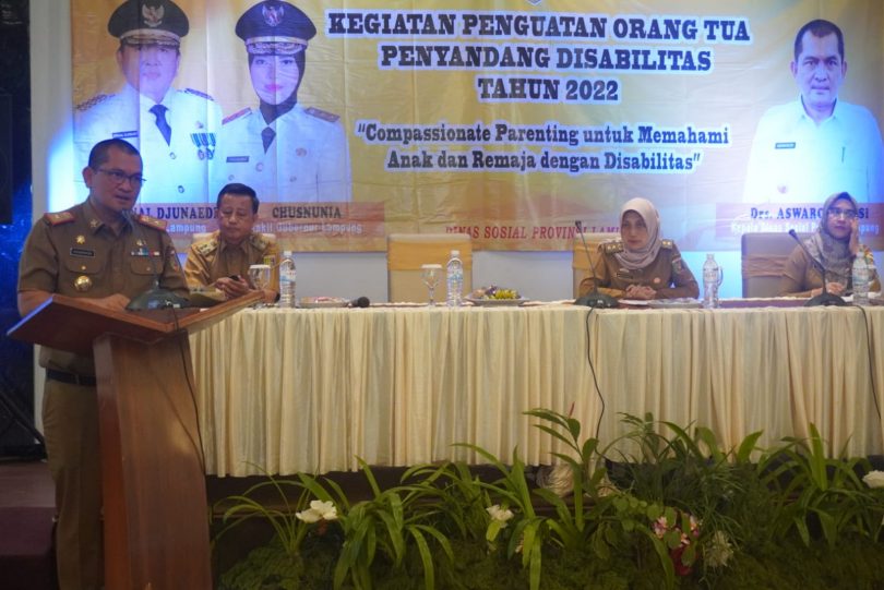 BANDARLAMPUNG — Dinas Sosial Provinsi Lampung melaksanakan kegiatan Penguatan Orang Tua Anak Penyandang Disabilitas Tahun 2022, di Hotel Bukit Randu, Selasa (4/10/2022).