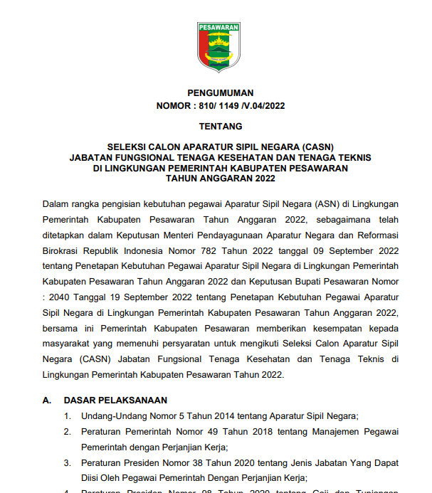 PENGUMUMAN SELEKSI CASN JABATAN FUNGSIONAL TENAGA KESEHATAN DAN TENAGA TEKNIS DI KABUPATEN PESAWARAN 2022 3 tahun ago3 tahun agoby admin Untuk Info lebih lanjut, silahkan unduh lampiran berikut : Pengumuman Seleksi CASN Jabfung Tenaga Kesehatan dan Tenaga Teknis di Kabupaten Pesawaran 2022 Kelengkapan Berkas Pelamar Tenaga Kesehatan Surat Lamaran PPPK Kabupaten Pesawaran Surat Pernyataan 5 Point