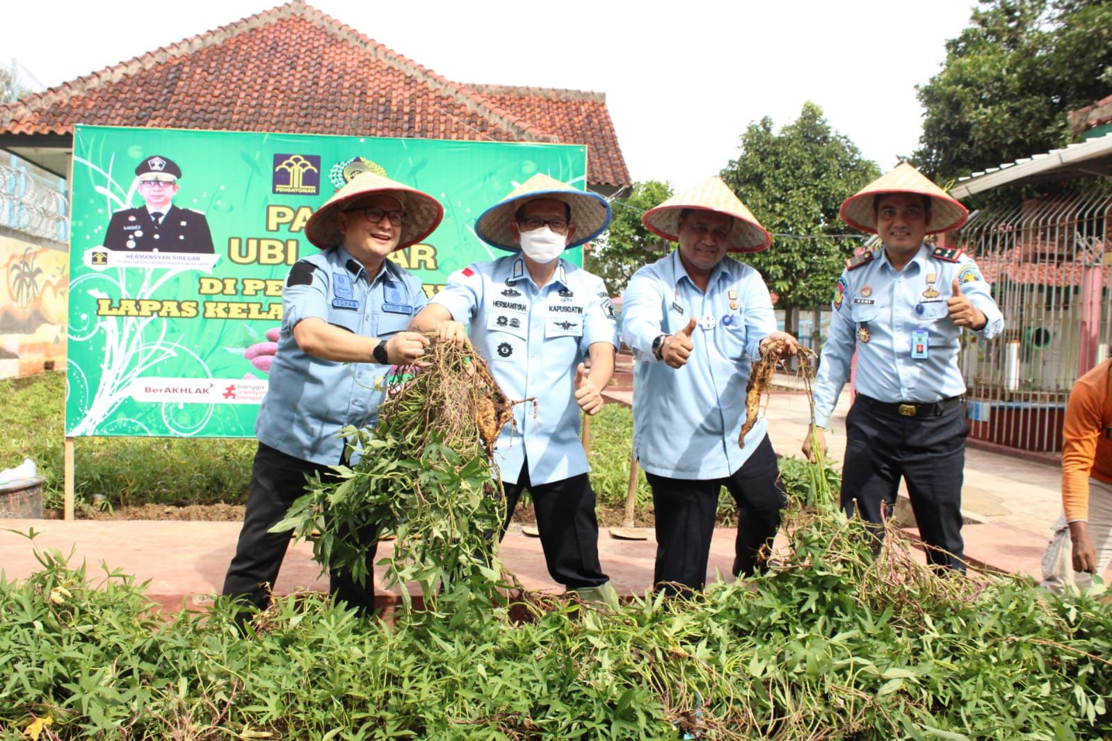 Selanjutnya, Plt Kakanwil serta jajaran menuju ke kebun di dalam blok hunian WBP guna memanen Ubi Jalar Putih yang sudah siap panen secara bersama-sama dengan memakai alat pelindung tubuh yaitu caping dan sepatu boot yang telah disediakan.