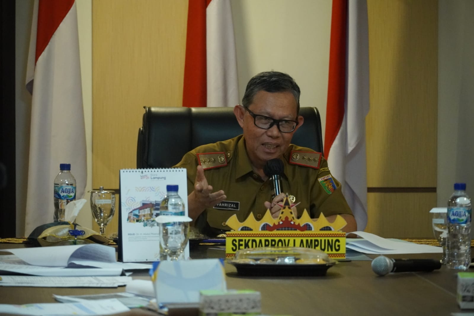 BANDARLAMPUNG—Sekretaris Daerah Provinsi Lampung Fahrizal Darminto, memimpin rapat evaluasi pelayanan publik PANRB dan Ombudsman, di ruang rapat Sakai Sambayan, Selasa (14/02/2023).