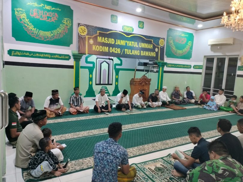 Menggala (Tulang Bawang) – Dalam rangka meningkatkan keimanan dan ketaqwaan kepada Allah SWT, Anggota Kodim 0426 Tulang Bawang melaksanakan Yasinan setiap malam Jumat yang dilaksanakan di Masjid Jamiyatul Ummah Makodim, Jln. Lintas Timur Sumatra, Km. 113, Kampung Bujung Tenuk, Kecamatan Menggala, Kabupaten Tulang Bawang, Kamis Malam 23 Februari 2023.