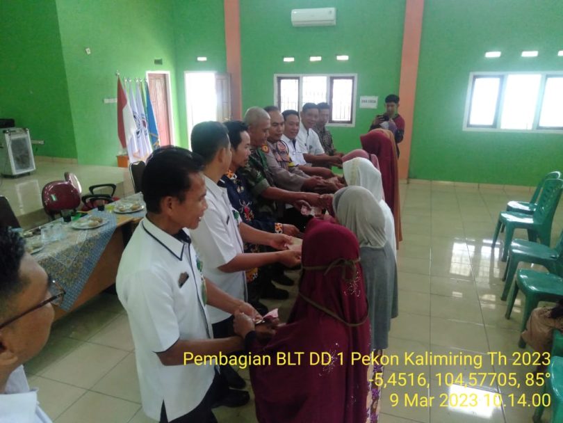 Tanggamus, – Pemerintah Pekon/desa Kalimiring Kecamatan Kotaagung Barat menyalurkan Bantuan Langsung Tunai Dana Desa (BLT-DD) tahap pertama selama 3 bulan kepada 38 Keluarga Penerima Manfaat (KPM) senilai Rp.900.000 di Gedung Serba Guna (GSG) Pekon setempat, Kamis (09/03/23).