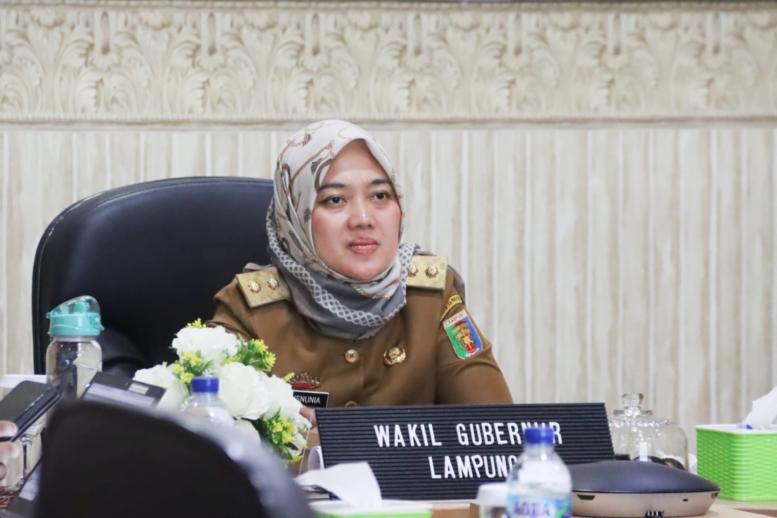 Bandar Lampung — Wakil Gubernur Lampung, Chusnunia, mengikuti Rapat Koordinasi Pengendalian Inflasi Daerah (virtual) yang dipimpin langsung oleh Menteri Dalam Negeri Tito Karnavian, di Ruang Command Center Lt.II Dinas Kominfotik Provinsi Lampung, Senin (13/03/23).