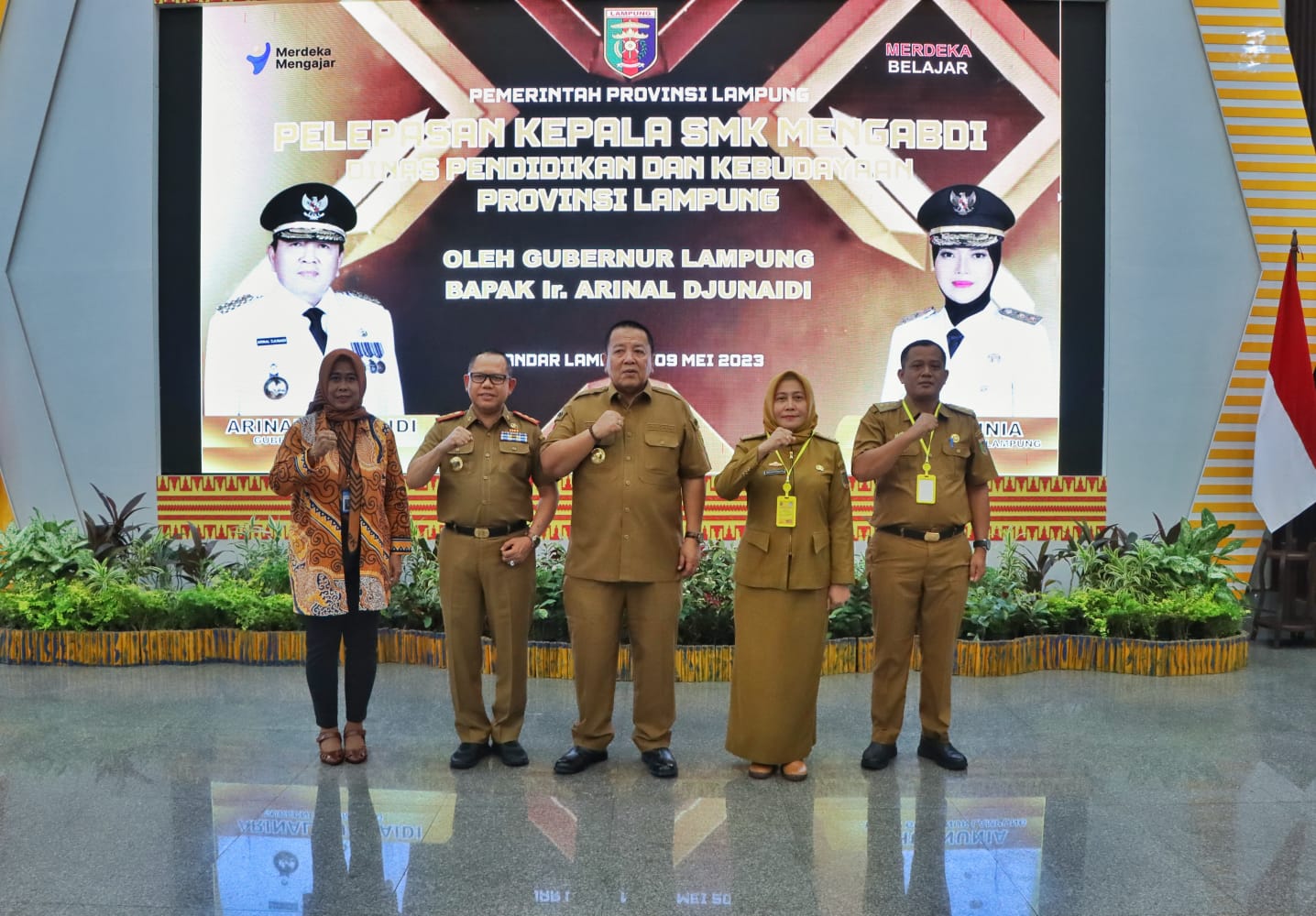 Bandar Lampung — Gubernur Arinal Djunaidi melakukan Pelepasan Kepala SMK Mengabdi Angkatan I Dinas Pendidikan dan Kebudayaan Provinsi Lampung Tahun 2023, di Mahan Agung, Selasa (09/05/2023).