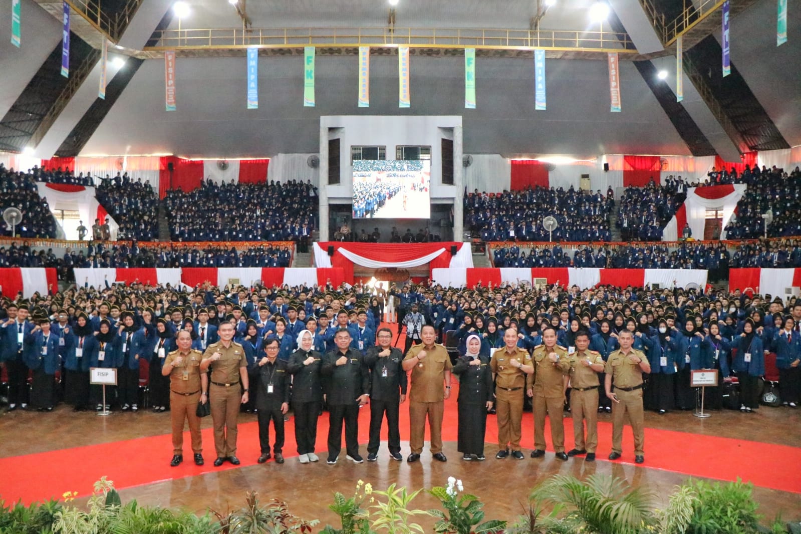 Kedatangan Gubernur Arinal Djunaidi bersama rombongan disambut meriah oleh ribuan mahasiswa baru UNILA dari berbagai Fakultas dan Program Studi yang berasal dari seluruh Kabupaten/Kota se-Provinsi Lampung maupun dari seluruh wilayah Indonesia.