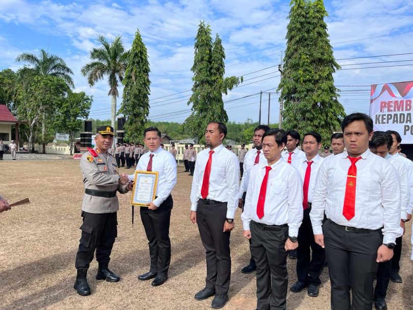 Kapolres Way Kanan AKBP Pratomo Widodo memberikan piagam penghargaan kepada 22 (dua puluh dua) personel Polres Way Kanan yang berprestasi, di lapangan Apel Mako Polres Way Kanan. Senin (11/09/2023).