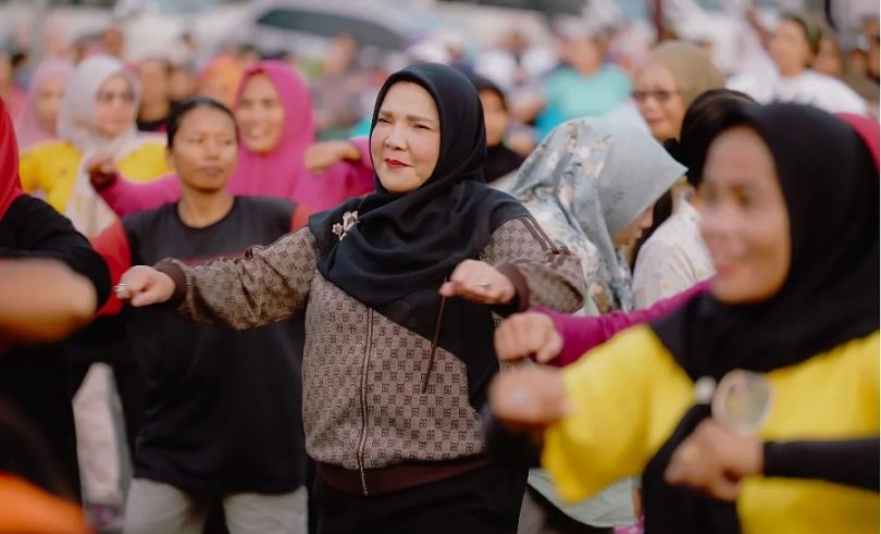 Walikota Bandar Lampung, Eva Dwiana senam sehat bersama warga Bandar Lampung, di taman UMKM Bung Karno Bandar Lampung. Sabtu (8/6/2024).
