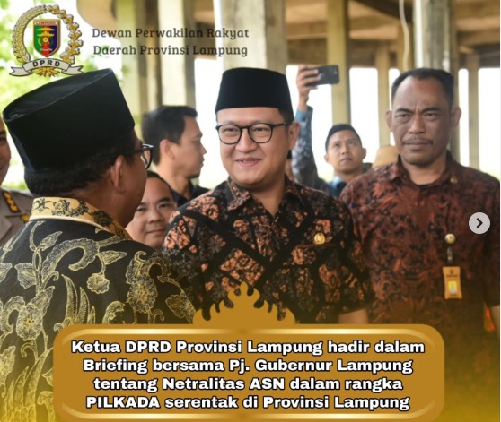 Bapak Ahmad Giri Akbar, SE., M.BA. serta Sekretaris DPRD Provinsi Lampung Ibu Hj. Tina Malinda, S.Sos., MM. menghadiri Acara Briefing bersama Pj. Gubernur Lampung tentang Netralitas ASN dalam PILKADA serentak di Provinsi Lampung tahun 2024 dan dilanjutkan Sholat Jum’at di Masjid Kota Baru, Jum’at (06/09/2024). turut hadir dalam acara tersebut mantan ketua DPRD periode 2019-2024 Bapak Mingrum Gumay, SH., MH.