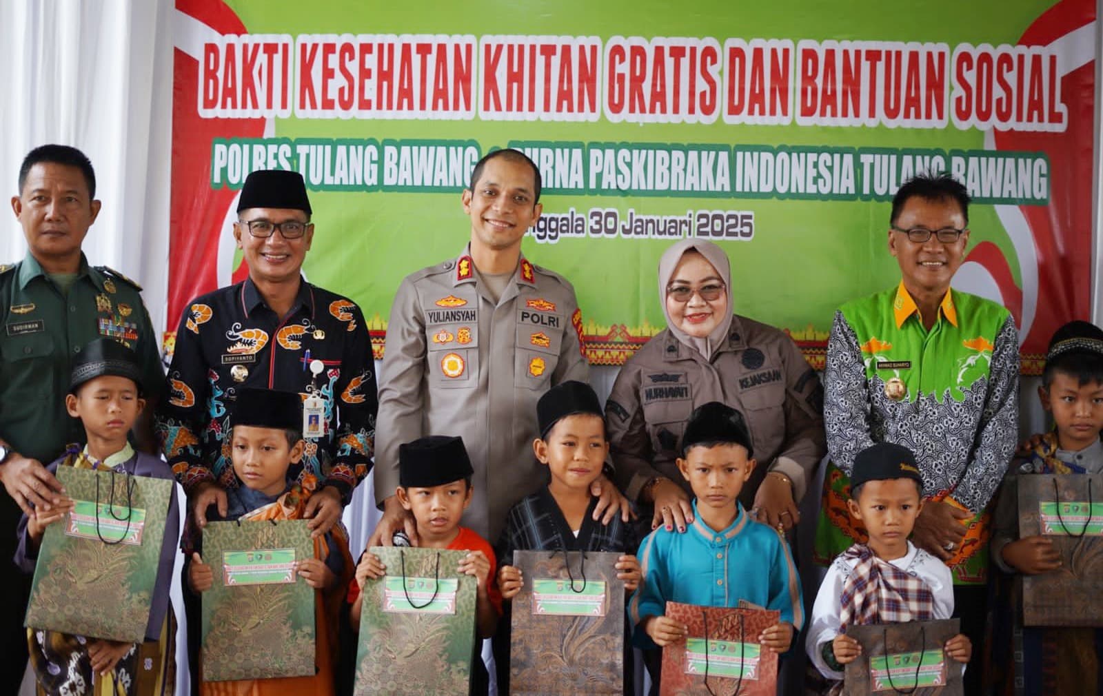 Polres Tulang Bawang, Polda Lampung, berkolaborasi dengan Purna Paskibraka Indonesia (PPI) Tulang Bawang menggelar kegiatan bakti kesehatan berupa khitanan massal gratis dan pembagian bantuan sosial (bansos) kepada masyarakat tidak mampu yang ada di wilayah hukumnya.