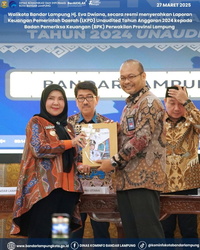 Walikota Bandar Lampung Hj. Eva Dwiana, secara resmi menyerahkan Laporan Keuangan Pemerintah Daerah (LKPD) Unaudited Tahun Anggaran 2024 kepada Badan Pemeriksa Keuangan (BPK) Perwakilan Provinsi Lampung pada Kamis (27/3/2025)