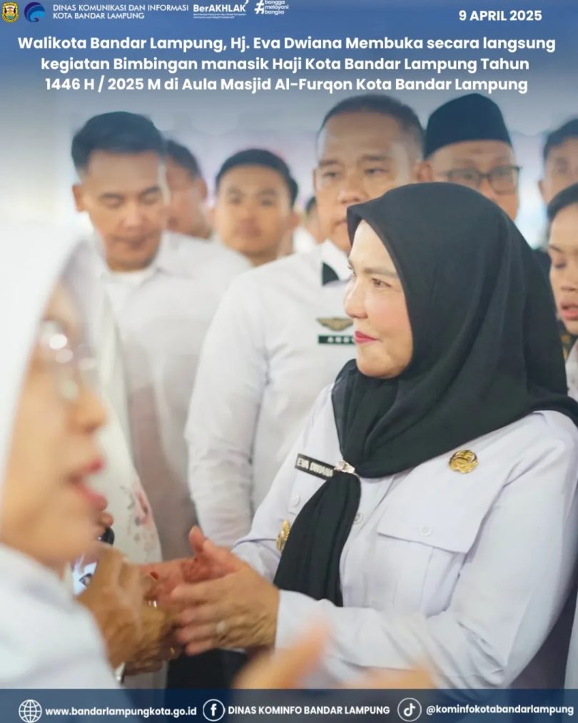 Walikota Bandar Lampung, Hj. Eva Dwiana Membuka secara langsung kegiatan Bimbingan manasik Haji Kota Bandar Lampung Tahun 1446 H / 2025 M di Aula Masjid Al-Furqon Kota Bandar Lampung, Rabu 09/04/2025.